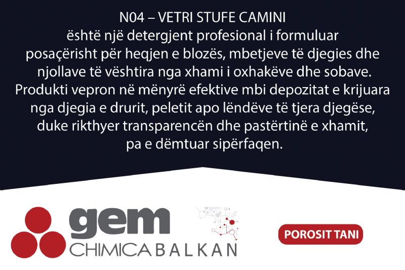 Emri i produktit: Detergjent per xhama oxhaku dhe sobe N04 – VETRI STUFE CAMINI nga Gem Chimica Balkan, pastrues per xham oxhaku, detergjent per heqjen e blozes, pastrues per xhama sobash, produkt per pastrim xhami oxhaku, detergjent per mbetje djegieje